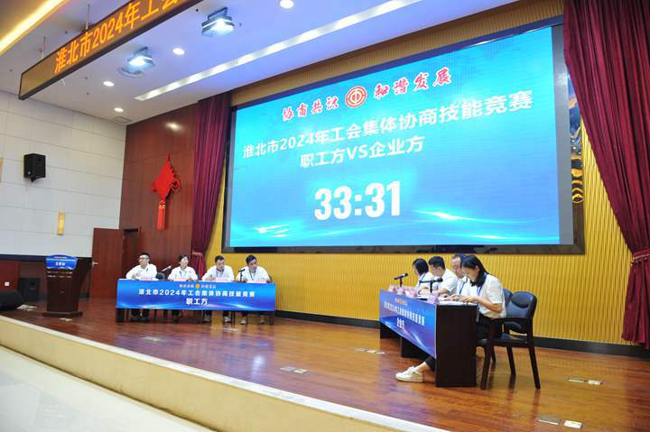 競賽以“協(xié)商共識、和諧發(fā)展”為競賽主題,旨在充分發(fā)揮集體協(xié)商制度在協(xié)調(diào)勞動關(guān)系中的重要作用,錘煉一支高素質(zhì)、善溝通、會協(xié)商、有擔(dān)當(dāng)?shù)募w協(xié)商人才隊伍,切實提升淮北市集體協(xié)商質(zhì)量,促進(jìn)勞動關(guān)系和諧穩(wěn)定。此次競賽匯集了全市各縣區(qū)、行業(yè)工會及淮北礦業(yè)集團(tuán)、皖北煤電集團(tuán)、中煤礦建集團(tuán)、淮海實業(yè)集團(tuán)10支代表隊伍,他們圍繞職工權(quán)益維護(hù)、福利待遇等問題,在模擬場景中進(jìn)行集體協(xié)商,由評委組對協(xié)商呈現(xiàn)效果進(jìn)行專業(yè)點評。各支參賽隊伍圍繞“協(xié)商共識、和諧發(fā)展”活動主題,依據(jù)理、法、情,透徹分析案例、準(zhǔn)確運(yùn)用政策、縝密邏輯推理、合理設(shè)置身份、流暢配合協(xié)作,各抒己見,據(jù)理力爭,較好展示了參賽隊伍的風(fēng)采,比賽現(xiàn)場氣氛熱烈,緊張有序。競賽評定團(tuán)體一等獎、二等獎、三等獎和個人獎項“最佳協(xié)商員”“優(yōu)秀協(xié)商員”“協(xié)商能手”,同時設(shè)置優(yōu)秀組織獎。