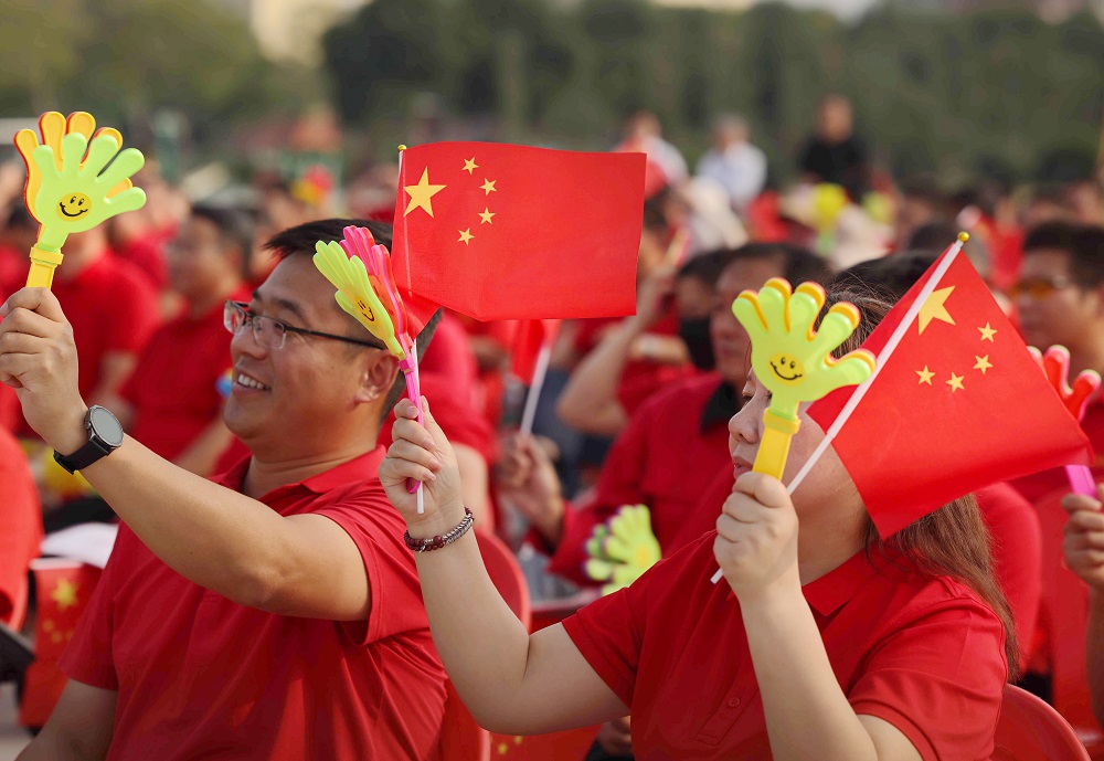 演出在舞蹈《鼓舞神州》中拉開序幕,隨后男女聲二重唱《新萬泉河水》、相聲《機智問答》、魔術(shù)《快樂十分》、京劇《武家坡》、小品《金錢與孝子》等節(jié)目輪番上演。一首首膾炙人口的歌曲,一段段婉轉(zhuǎn)悠揚的旋律,一支支優(yōu)美多姿的舞蹈,讓現(xiàn)場觀眾沉浸在歡樂的氛圍中。臺上演員們?nèi)橥度耄_下觀眾積極互動,或跟唱歌曲,或打著節(jié)拍,現(xiàn)場氣氛融融。最后,演出在歌曲《奮斗吧追夢人》中圓滿落下帷幕。