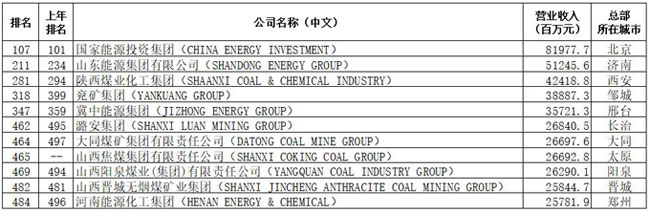 從中國(guó)上榜煤炭企業(yè)看,共有11家企業(yè)上榜,較上年凈增1家,山西焦煤集團(tuán)再次進(jìn)入500強(qiáng)名單。國(guó)家能源集團(tuán)、山東能源集團(tuán)、陜煤集團(tuán)繼續(xù)位列煤炭行業(yè)入圍企業(yè)三甲,兗礦集團(tuán)超過(guò)冀中能源集團(tuán)位列第四位,且其成為排名上升最快煤炭企業(yè)(上升81位)。11家企業(yè)中,國(guó)家能源集團(tuán),晉煤集團(tuán)位次略有下滑,其余企業(yè)排名位次均有所提升。