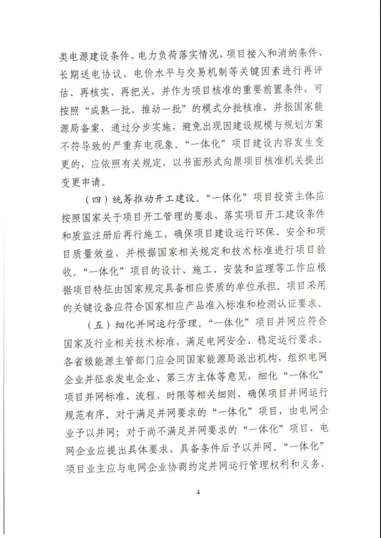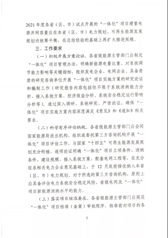 工作要求:積極開展方案論證??茖W(xué)有序評估納規(guī)。落實項目核準(zhǔn)要求。統(tǒng)籌推動開工建設(shè)。細(xì)化并網(wǎng)運(yùn)行管理。優(yōu)先推進(jìn)鄉(xiāng)村振興項目。鼓勵重大創(chuàng)新示范。在上述工作要求中,《通知》要求,各省級能源主管部門應(yīng)開展“一體化”項目評估工作,與國家“十四五”可再生能源發(fā)展規(guī)劃充分銜接,逐項論證明確“一體化”項目立項條件、消納條件、建設(shè)規(guī)模、接入系統(tǒng)方案、配套電網(wǎng)工程等,在充分征求相關(guān)電力企業(yè)意見基礎(chǔ)上,于12月底前擇優(yōu)納入本?。▍^(qū)、市)電力規(guī)劃。