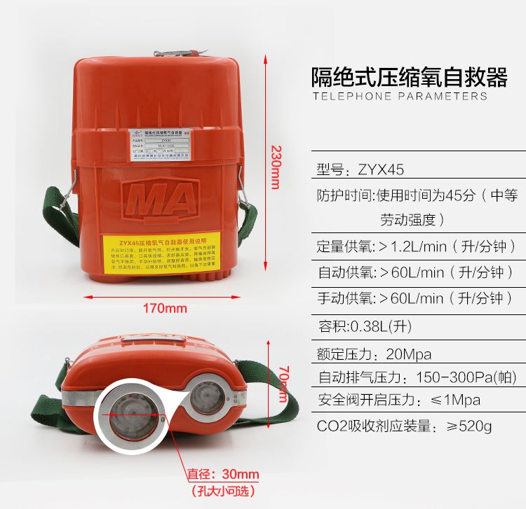 3、清凈罐內裝入定量的符合標準的CO2吸收劑形成CO2過濾系統。平時所有系統裝置都裝在殼體之中,使用者能通過上蓋上的觀察窗清楚地看到壓力表的壓力指示。在下殼上設有皮帶孔和背帶,使用者可固定在礦工皮帶上或挎在肩上。4、供氧方式有以下三種: