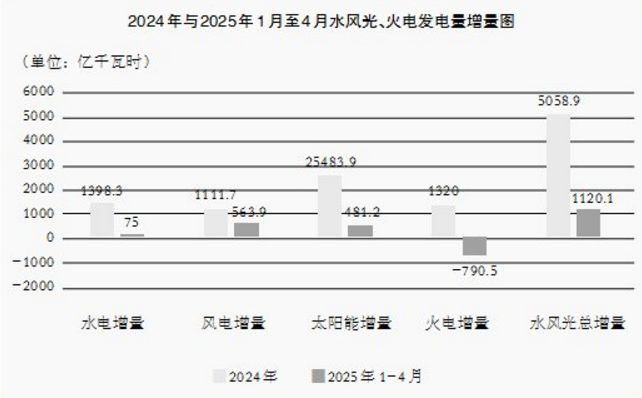 非化石能源替代已經成為能源結構優化調整的重點方向和中長期趨勢性選擇。近年來,能源行業深入貫徹落實碳達峰碳中和戰略,力爭在2030年前實現碳達峰目標。我國非化石能源實現了跨越式發展,風電、太陽能發電裝機規??焖僭黾?,水電、風電、太陽能發電量逐年大幅增加,對煤炭等傳統能源替代作用越來越明顯。我國新能源發展經歷了10多年不斷創新培育,逐漸由起步階段向快速發展階段轉變,一批大型水電站陸續建成投產,一大批沙戈荒大型風電、光伏基地和海上風電、農村分布式光伏發電項目投入運營,水電、風電、太陽能發電量逐年大幅增加。2024年,水電、風電、太陽能發電量增量為5059億千瓦時,占全國發電量增量的79.9%。今年前4個月,全國水電、風電、太陽能發電量增量為1120.1億千瓦時,火電發電量同比減少790.5億千瓦時,非化石能源對傳統化石能源的替代作用顯著增強。