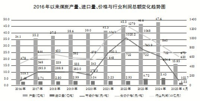 2025年以來,煤炭需求不足態勢延續。今年前4個月,全國火電發電量同比下降4.1%,粗鋼產量同比增長0.4%、表觀消費量同比下降1.7%,水泥產量、平板玻璃產量同比分別下降2.8%和4.8%,煤化工主要產品產量保持增長。煤炭消費需求整體偏弱,煤炭供應量持續增加,全社會庫存創歷史新高,市場價格大幅下降,煤炭企業經濟效益大幅下滑,部分老礦區煤炭企業出現虧損。